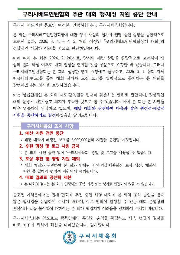 구리시배드민턴협회 주관 대회 행·재정 지원 ...