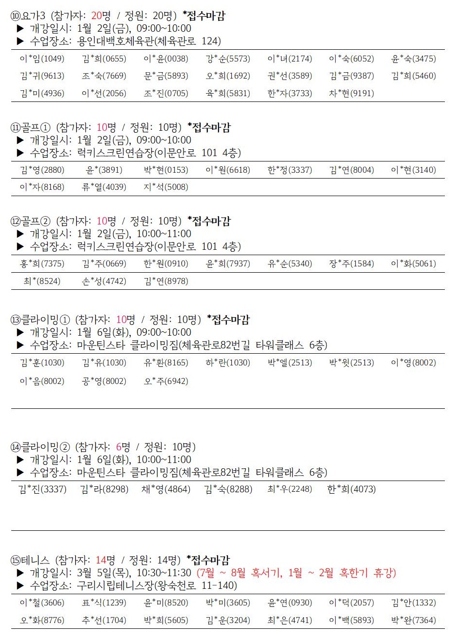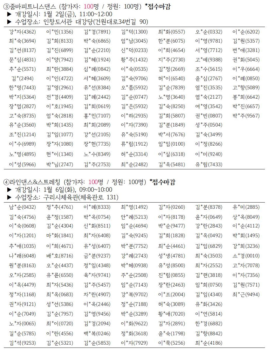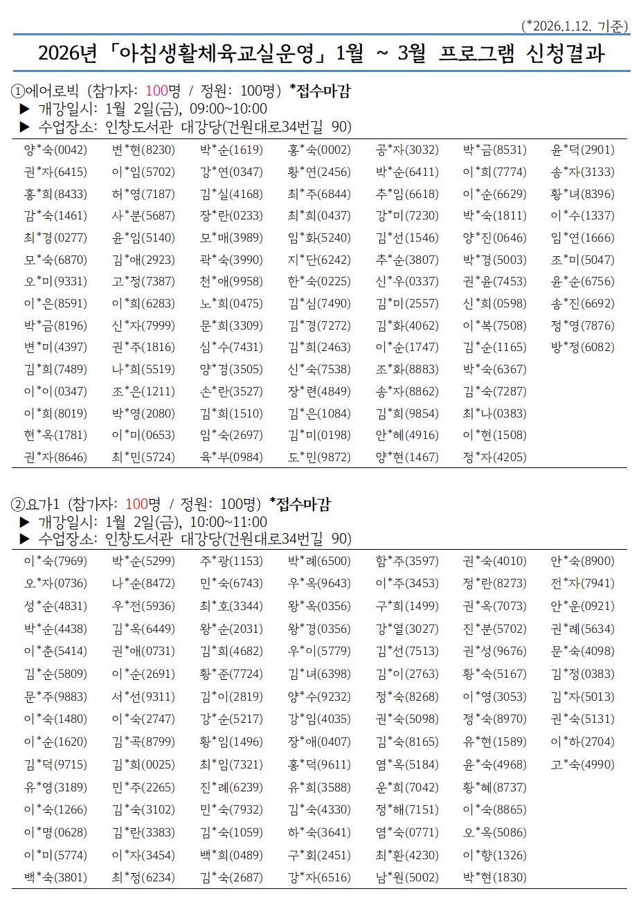 「아침생활체육교실 운영」 1월~3월 신청결과