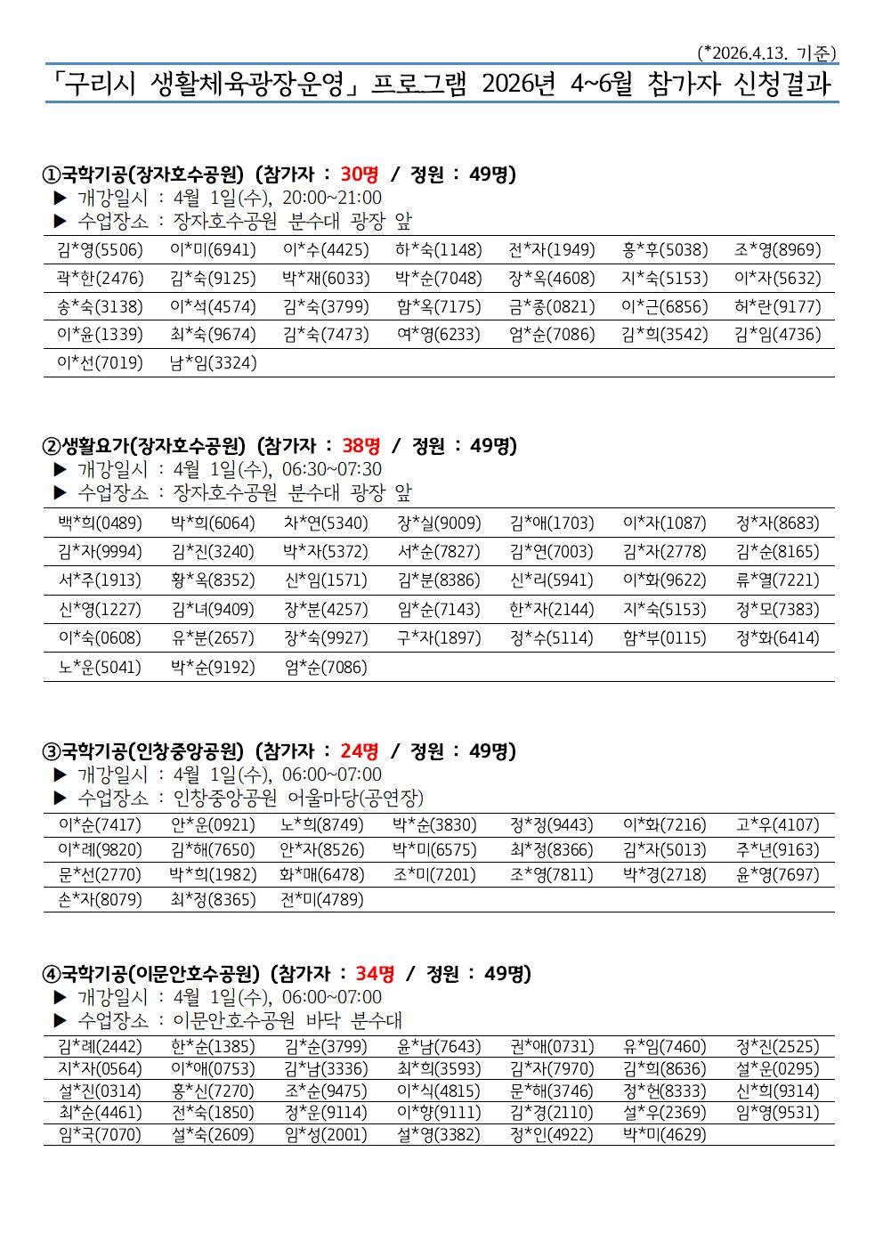 「구리시 생활체육광장운영」 4~6월 신청결과