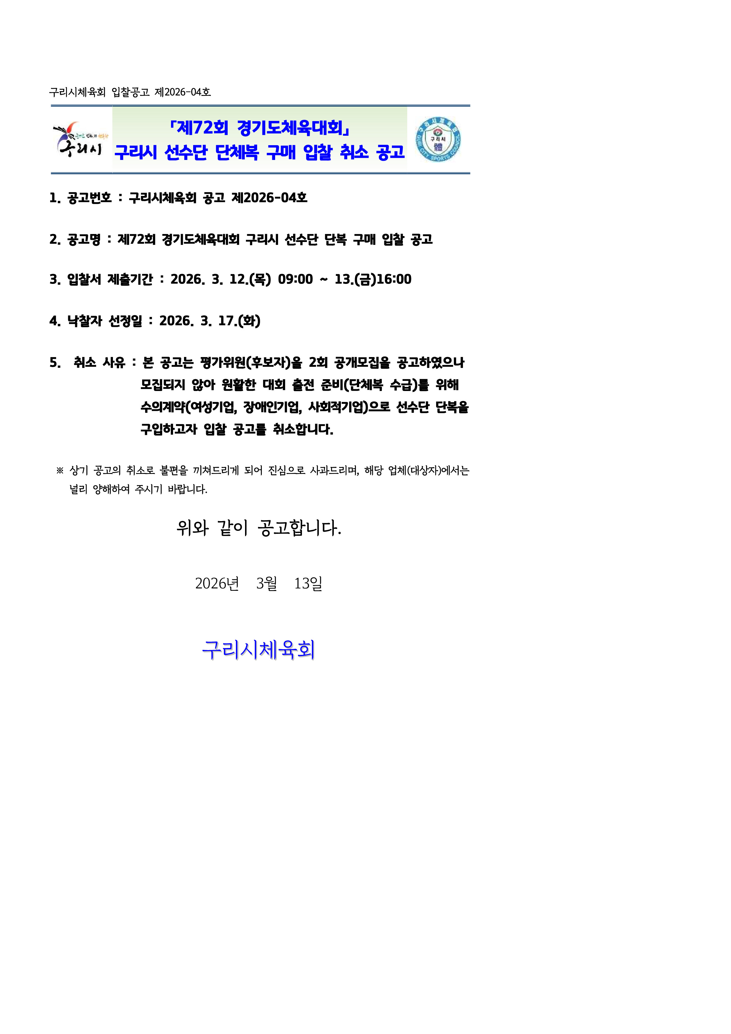 「제72회 경기도체육대회」 구리시 선수단 단체복 구매 입찰 취소 공고