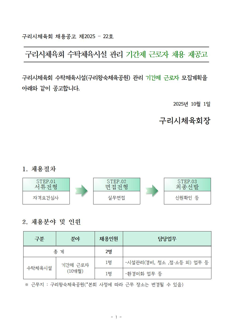 구리시체육회 수탁체육시설 기간제근로자 채용 재공고