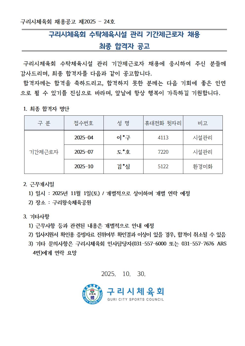 구리시체육회 수탁체육시설 기간제근로자 채용 최종 합격자 공고