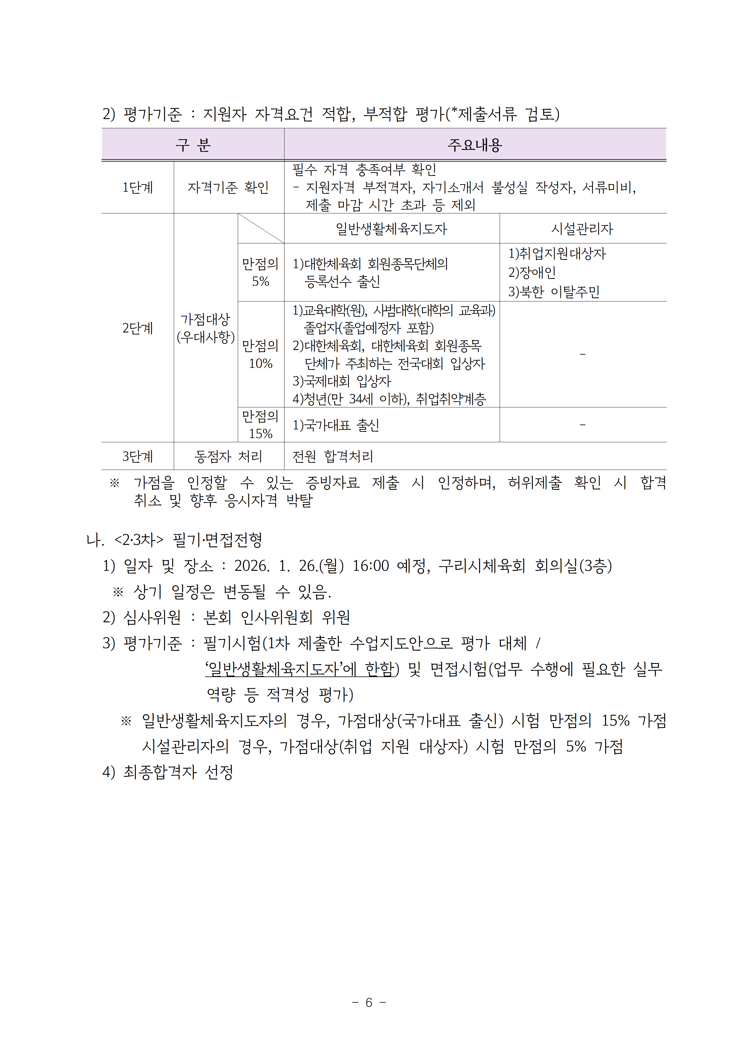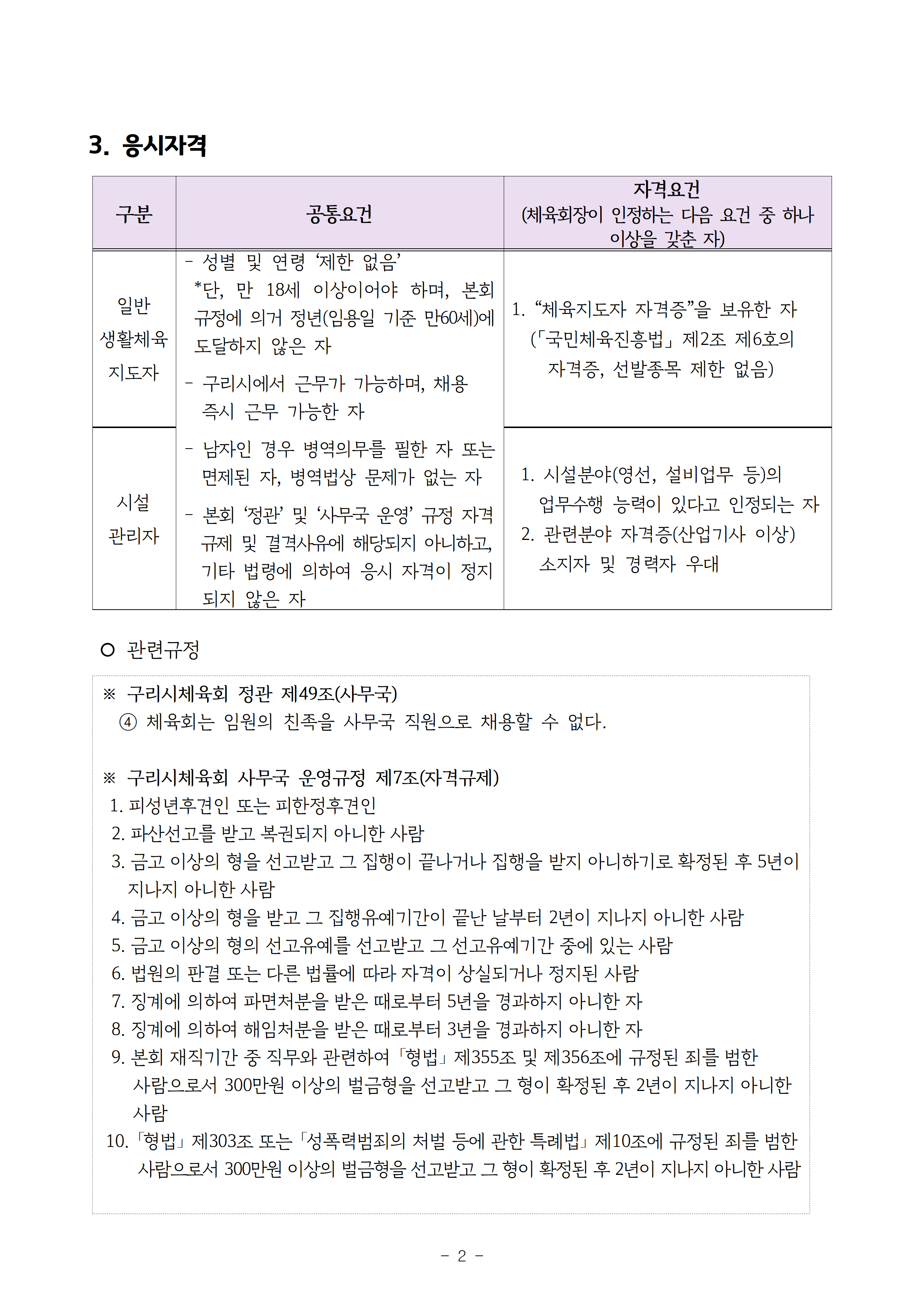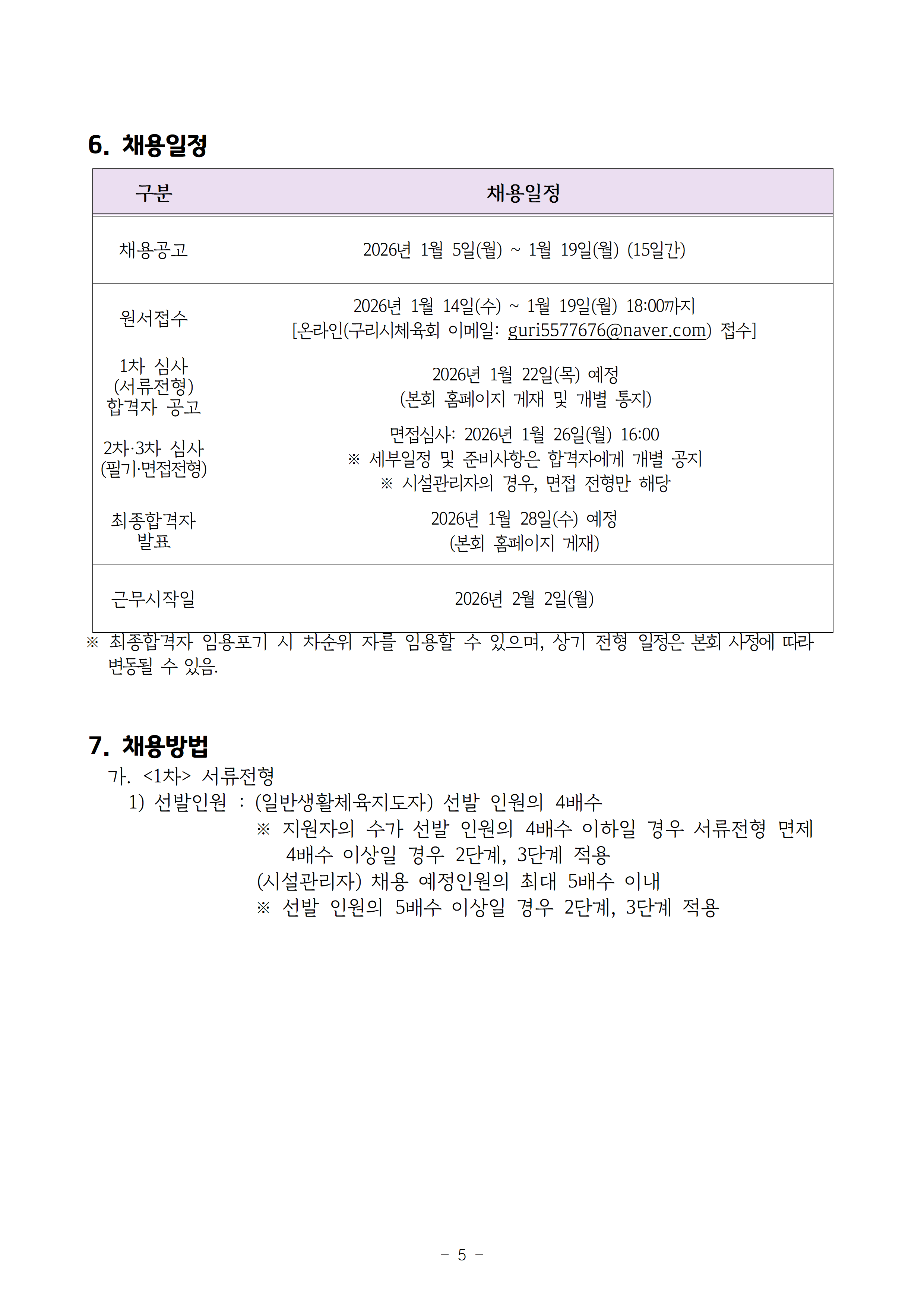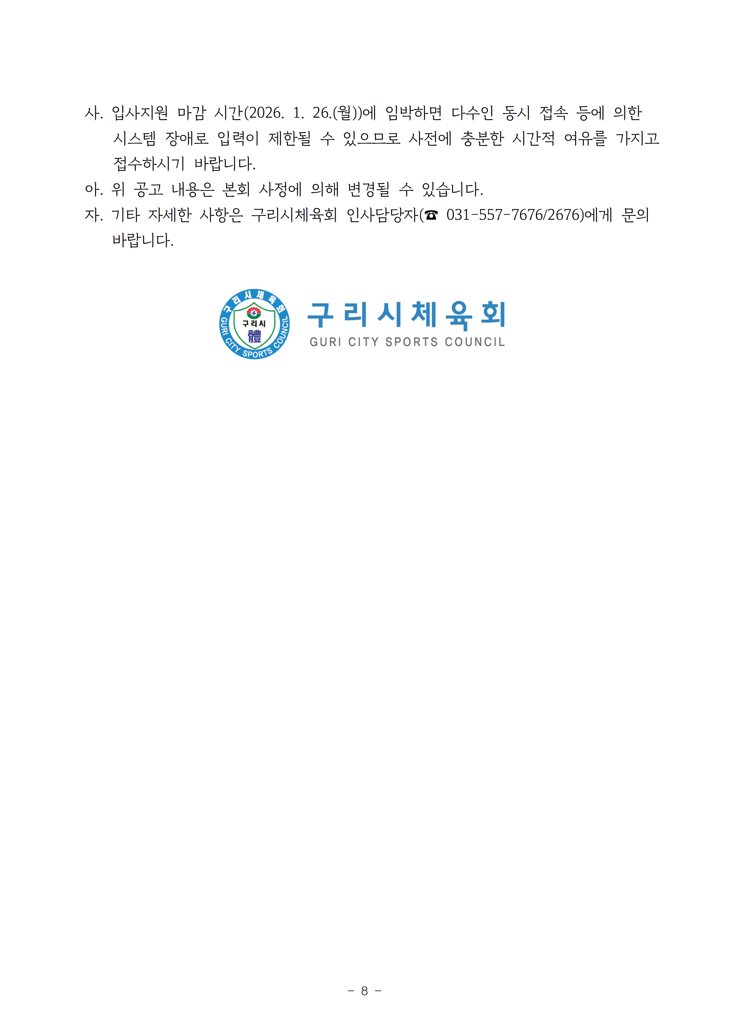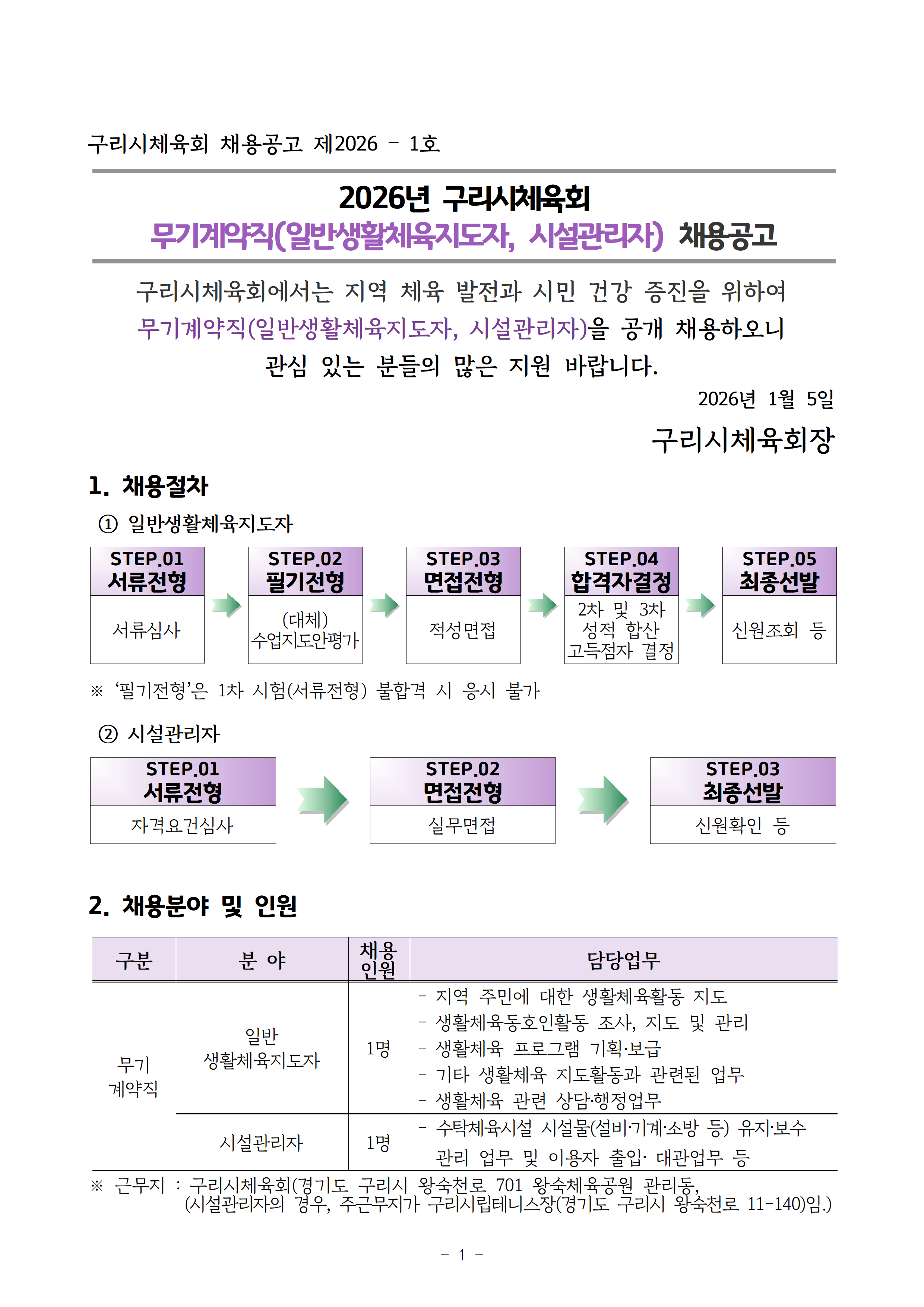 2026년 구리시체육회 무기계약직(일반생활체육지도자, 시설관리자) 채용공고