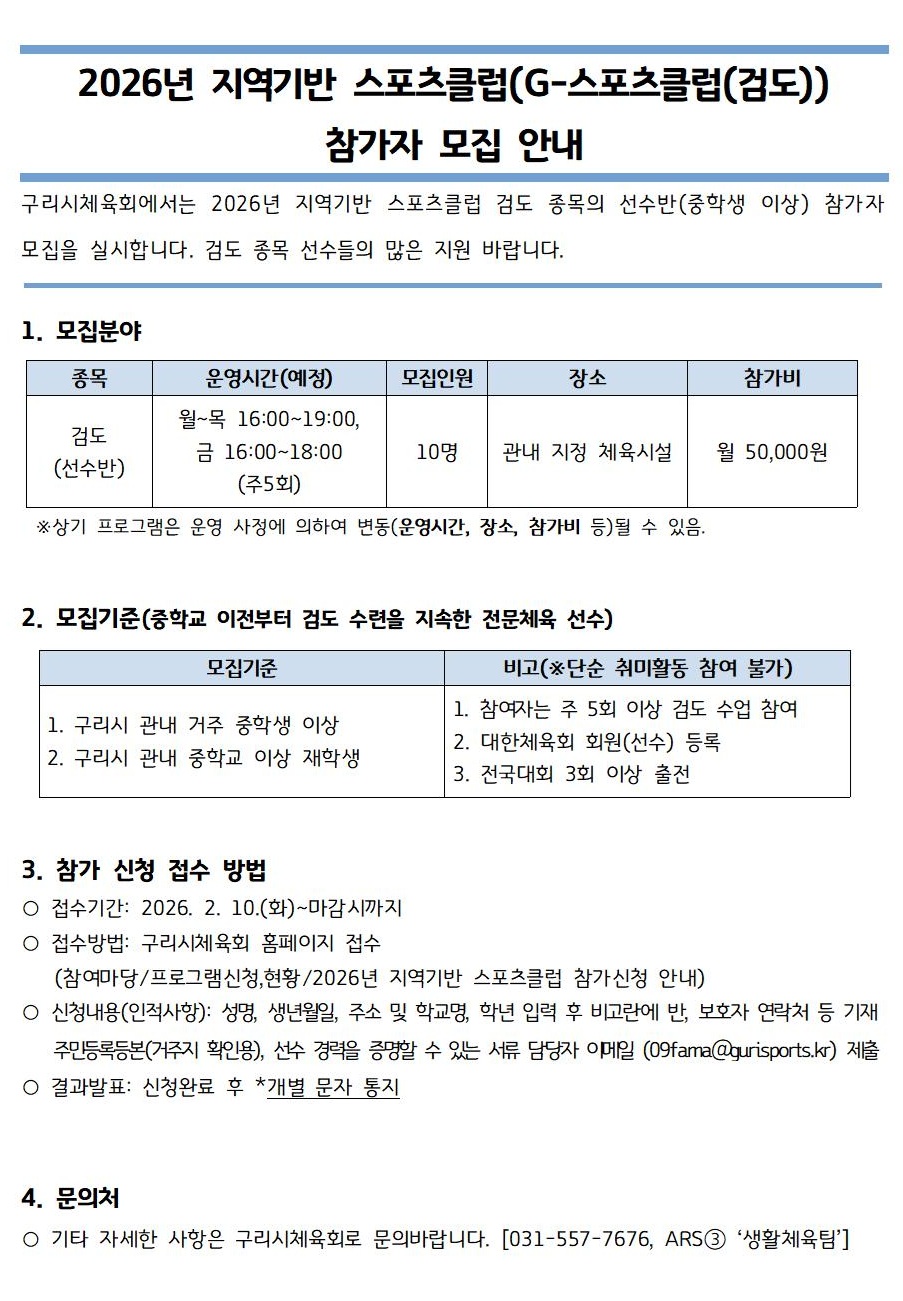 2026년 지역기반 G-스포츠클럽(검도) 참가신청 안내