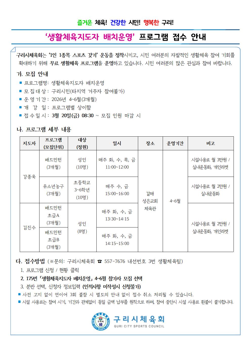 「생활체육지도자 배치운영」 4~6월 참가자 모집