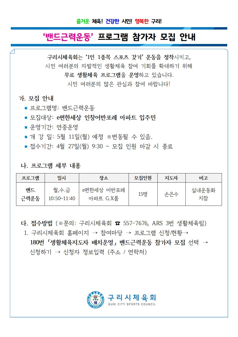 「생활체육지도자 배치운영」 밴드근력운동 참가자 모집