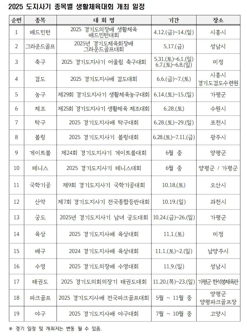 도지사기(배)·도의장기(배)·도체육회장기(배) 종목별 대회