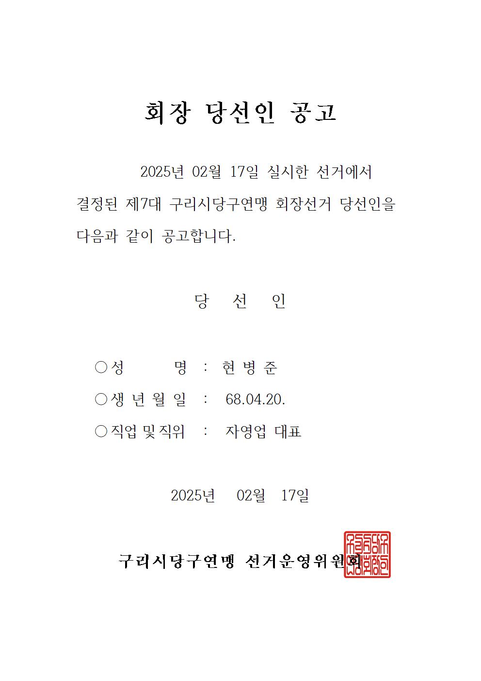(배드민턴)구리시배드민턴협회 회장 당선인 공고
