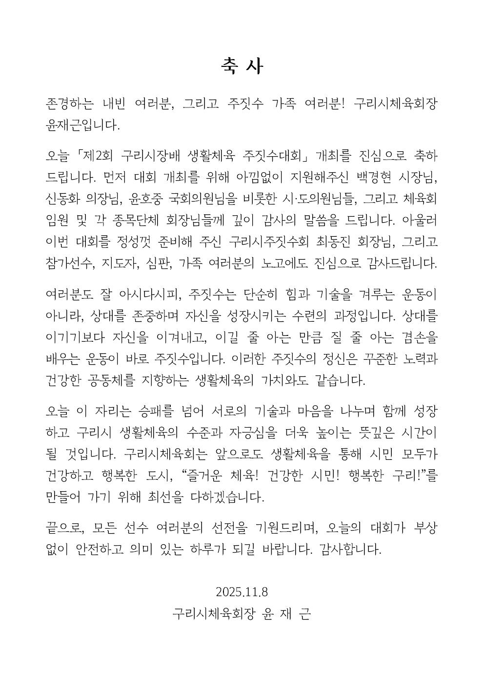제2회 구리시장배 생활체육 주짓수대회 체육회장 축사