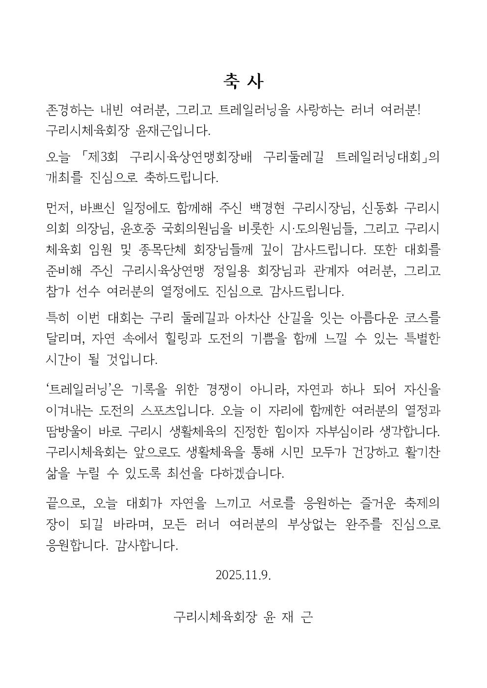 제3회구리시육상연맹회장배 구리둘레길 트레일러닝대회 체육회장 축사