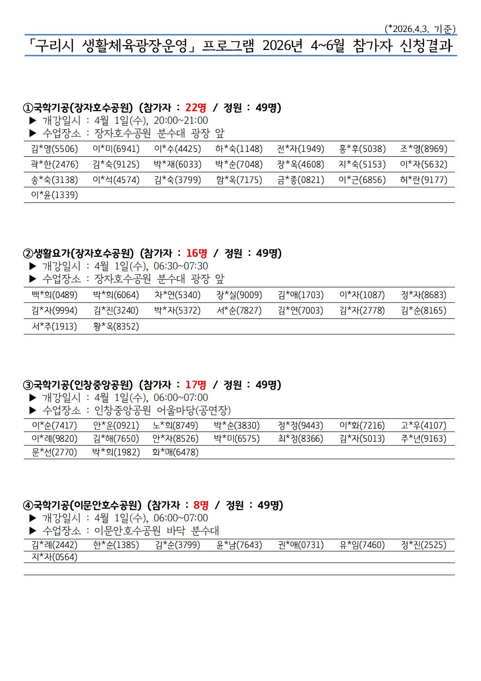 「구리시 생활체육광장운영」 4~6월 신청결과