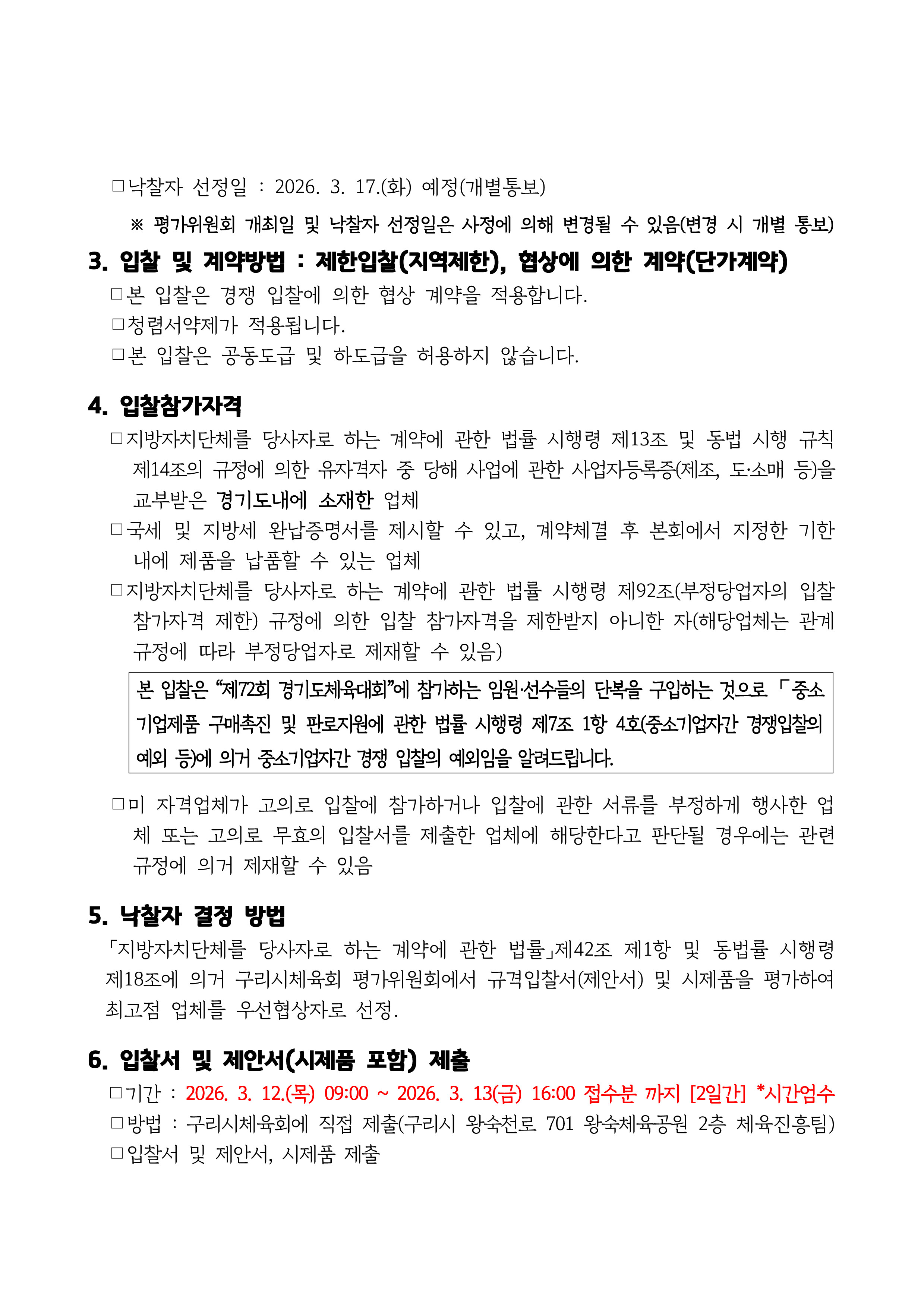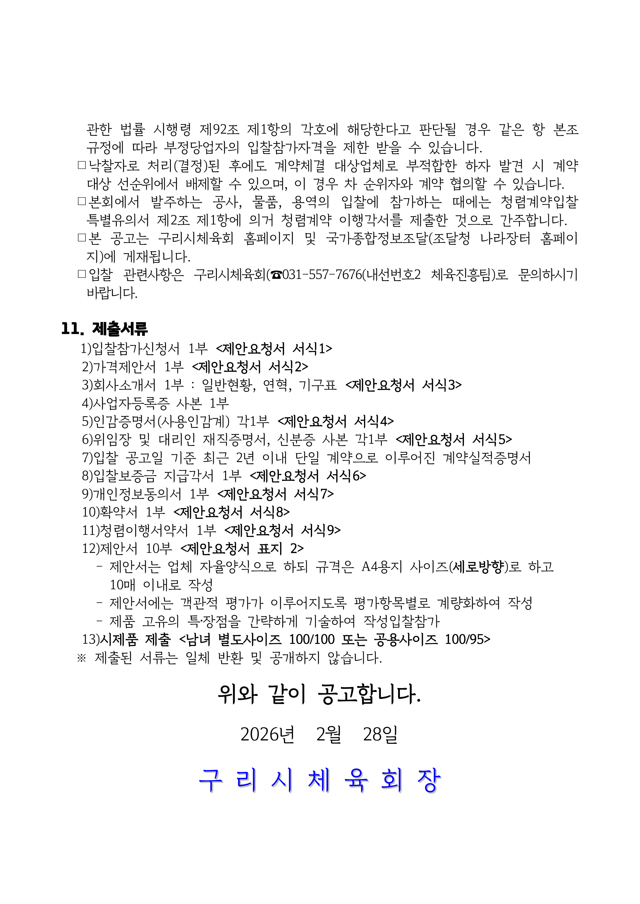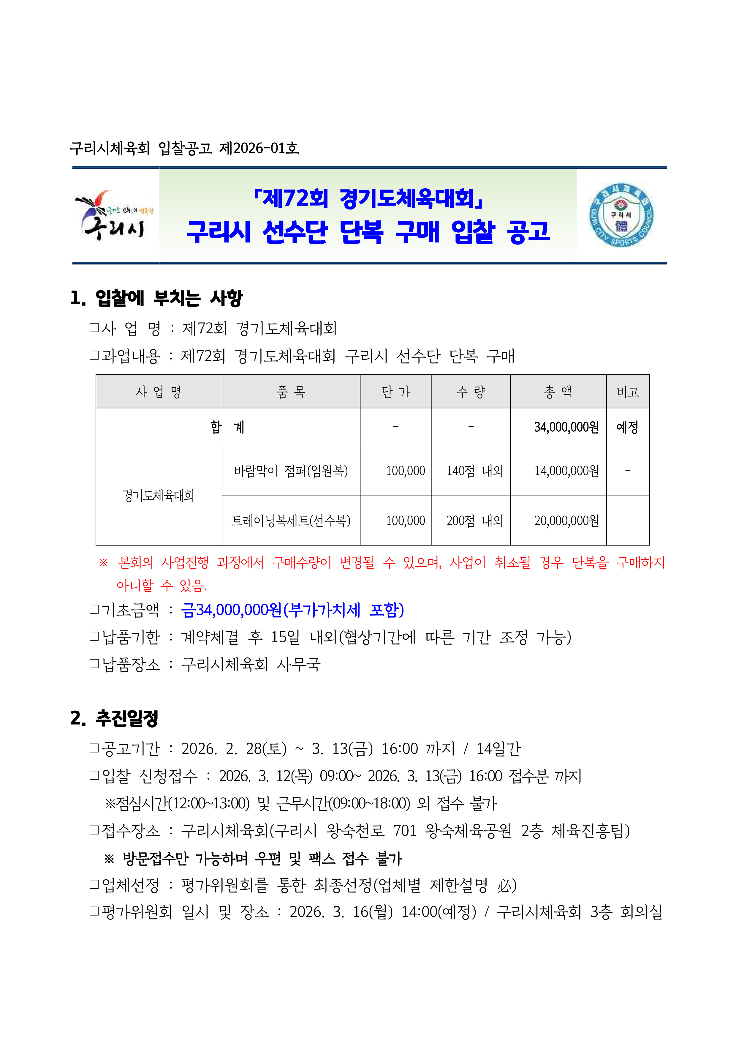 「제72회 경기도체육대회」 구리시선수단 단복 구매 입찰 공고