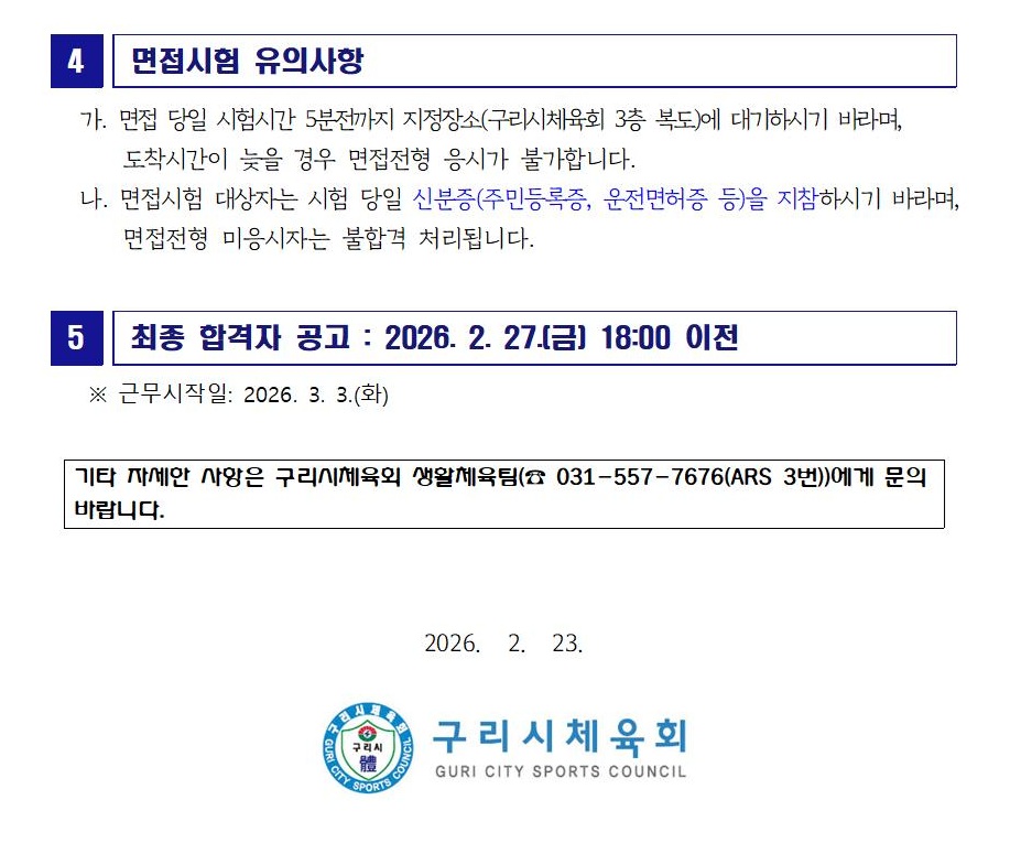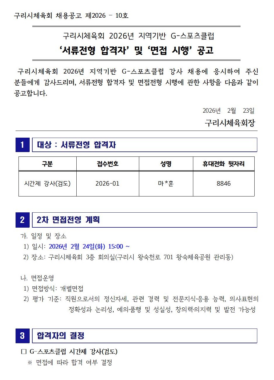 2026년 구리시체육회 일반생활체육지도자 육아휴직 대체인력 채용 \'서류전형 합격자\' 및 \'...