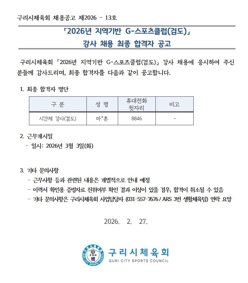 「2026년 지역기반 G-스포츠클럽(검도)」 강사 채용 최종 합격자 공고